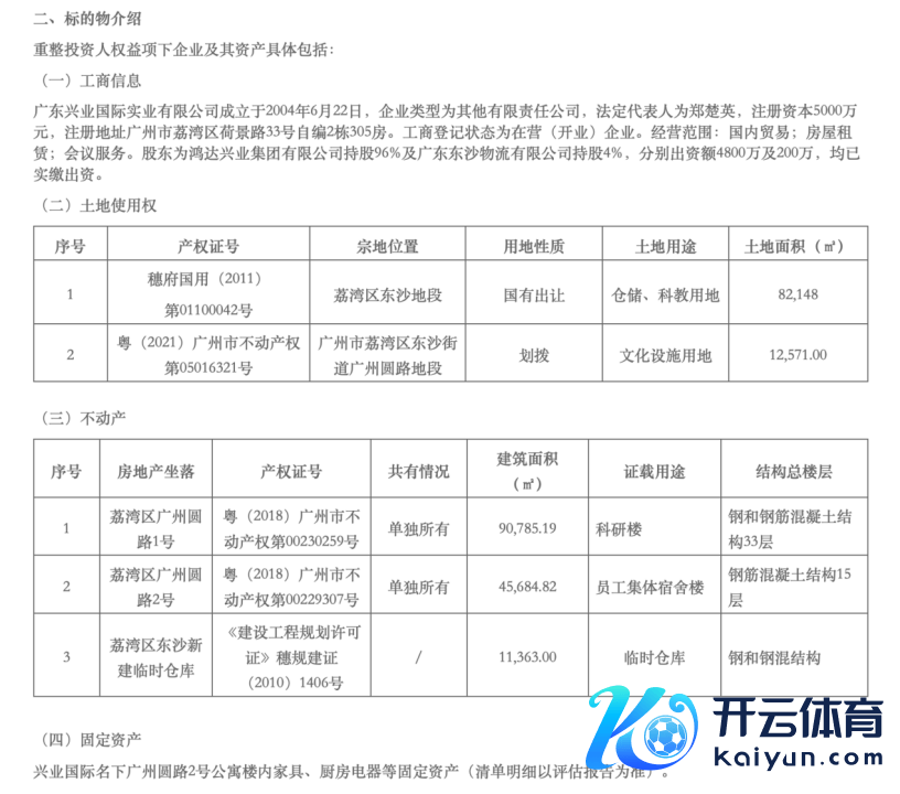 具体地方物包括2宗地盘使用权、3项不动产,以及固定金钱。本次评估价近17亿元,起拍价细目为13.60亿元。
