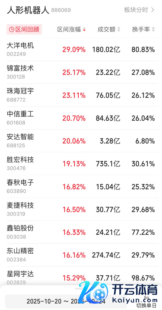 10月20日至10月24日,东谈主形机器东谈主板块上市公司股价涨幅显耀。同花顺数据露出,大洋电机涨幅达29.09%,锦富时候(维权)、珠海冠宇、中信重工、安达智能涨幅均跳跃20%。