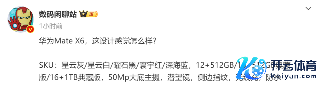 据博主@数码谈天站 本日爆料,华为Mate X6后置50Mp大底主摄、潜望镜,缓助侧边指纹解锁,缓助无线充电,并有防水性能。