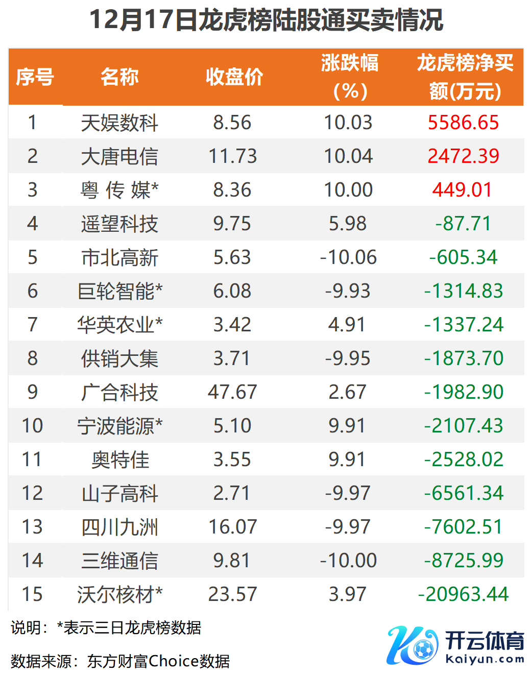 当天陆股通参与龙虎榜中个股共触及15股,其中3股被陆股通净买入开云体育,天娱数科买入最多,净买入5586.65万元;另外12股被陆股通净卖出,沃尔核材被卖出最多,三日净卖出约2.1亿元。