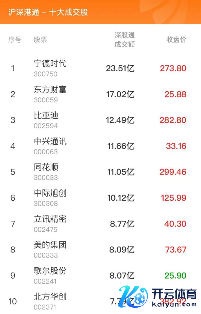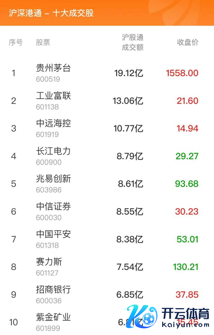 交往所公布确当日沪深港通十大成交股知道,贵州茅台、工业富联、中远海控位列沪股通前三,成交额分裂为19.12、13.06、10.77亿元;宁德期间、东方钞票、比亚迪位列深股通前三,成交额分裂为23.51、17.02、12.49亿元。