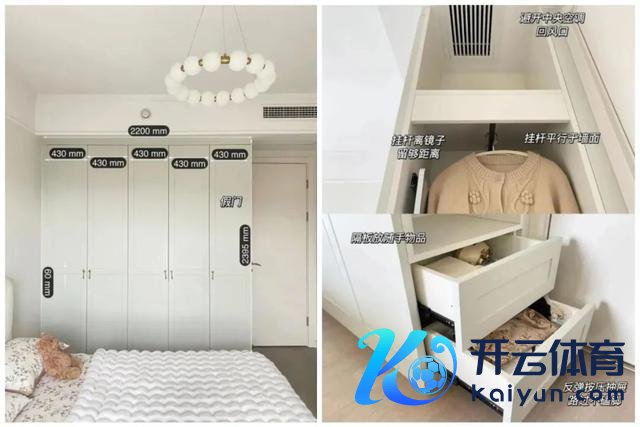 若卧室里的衣柜假想在了床头一侧,那么不错在衣柜侧面假想一块次净衣区,深度43cm,中间挂衣区,衣架纵向装配,下方作念两个抽屉,上方留空放包包。