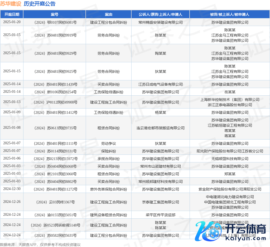 案号:(2024)苏0114民初9331号审理法院:南京市雨花台区东说念主民法院案由:保障纠纷当事东说念主信息: 原告/上诉东说念主:苏华确立集团有限公司 被告/被上诉东说念主:阳光财产保障股份有限公司江苏省分公司开庭日历:2025年1月7日左证统计,近一年内以苏华确立集团有限公司为当事东说念主的历史开庭公告有450则,其中案由为“确立工程施工条约纠纷”的公告以69则居首,其次为“交易条约纠纷”有65则,“劳务条约纠纷”有61则。历史开庭公告(前20条)如下:
