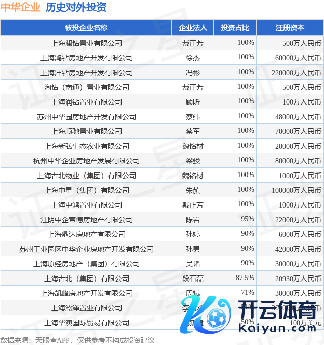 本站讯息,把柄天眼查APP披露,中华企业(600675.SH)新增一皆对外投资事件,被投资公司为上海澜钻置业有限公司,法定代表东谈主戴正芳,投资占比为100%。该公司从事房地产业,注册成本为500万东谈主民币。现在,中华企业共存在对外投资28项,投资占比前20的技俩见下表: